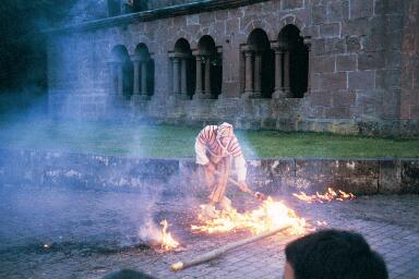 Hanswurst verteilt die Glut und löscht das Feuer.